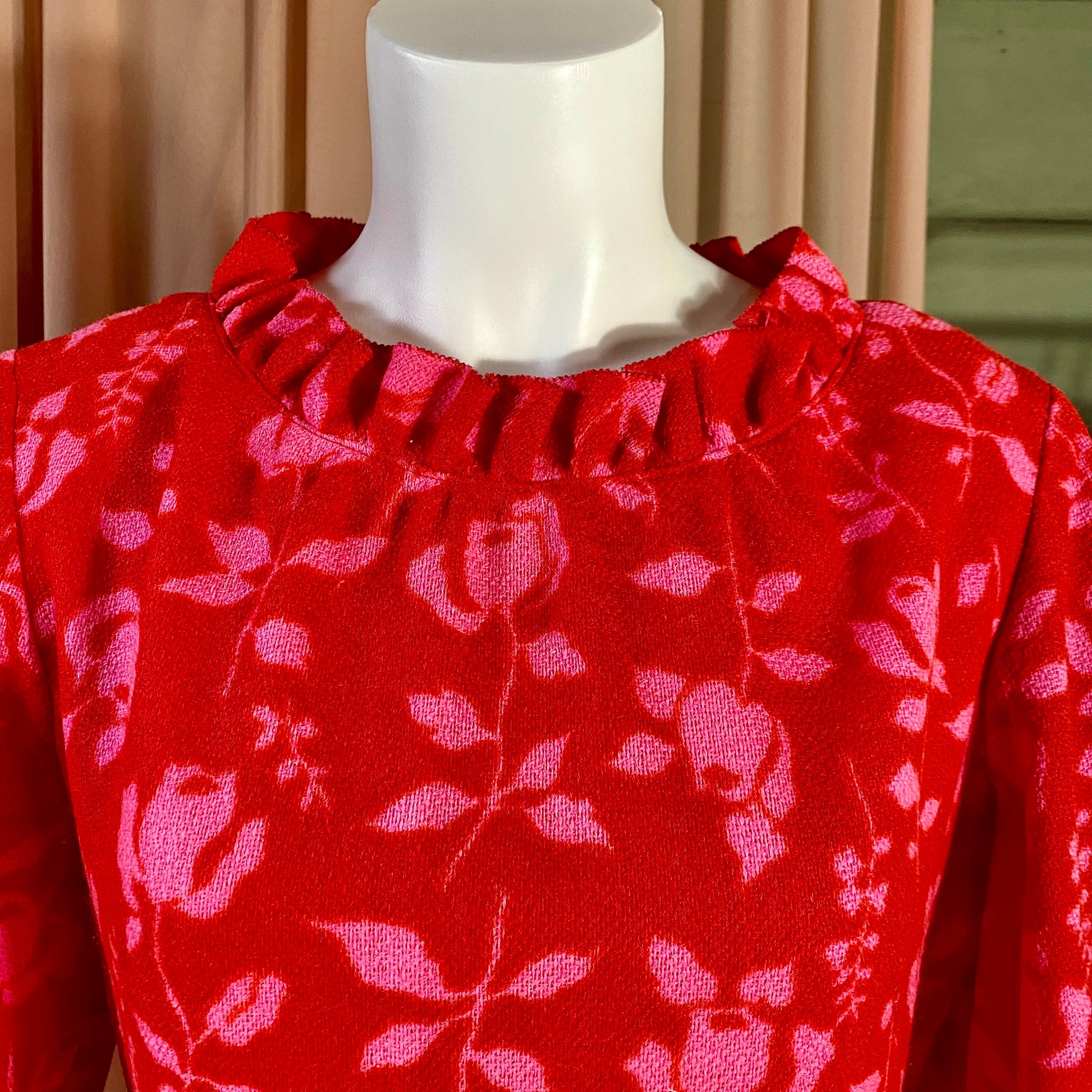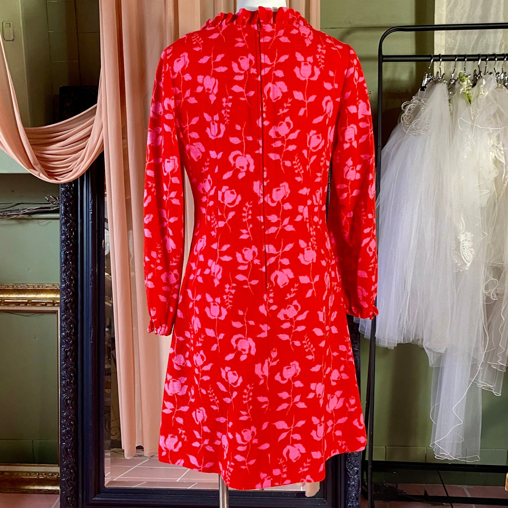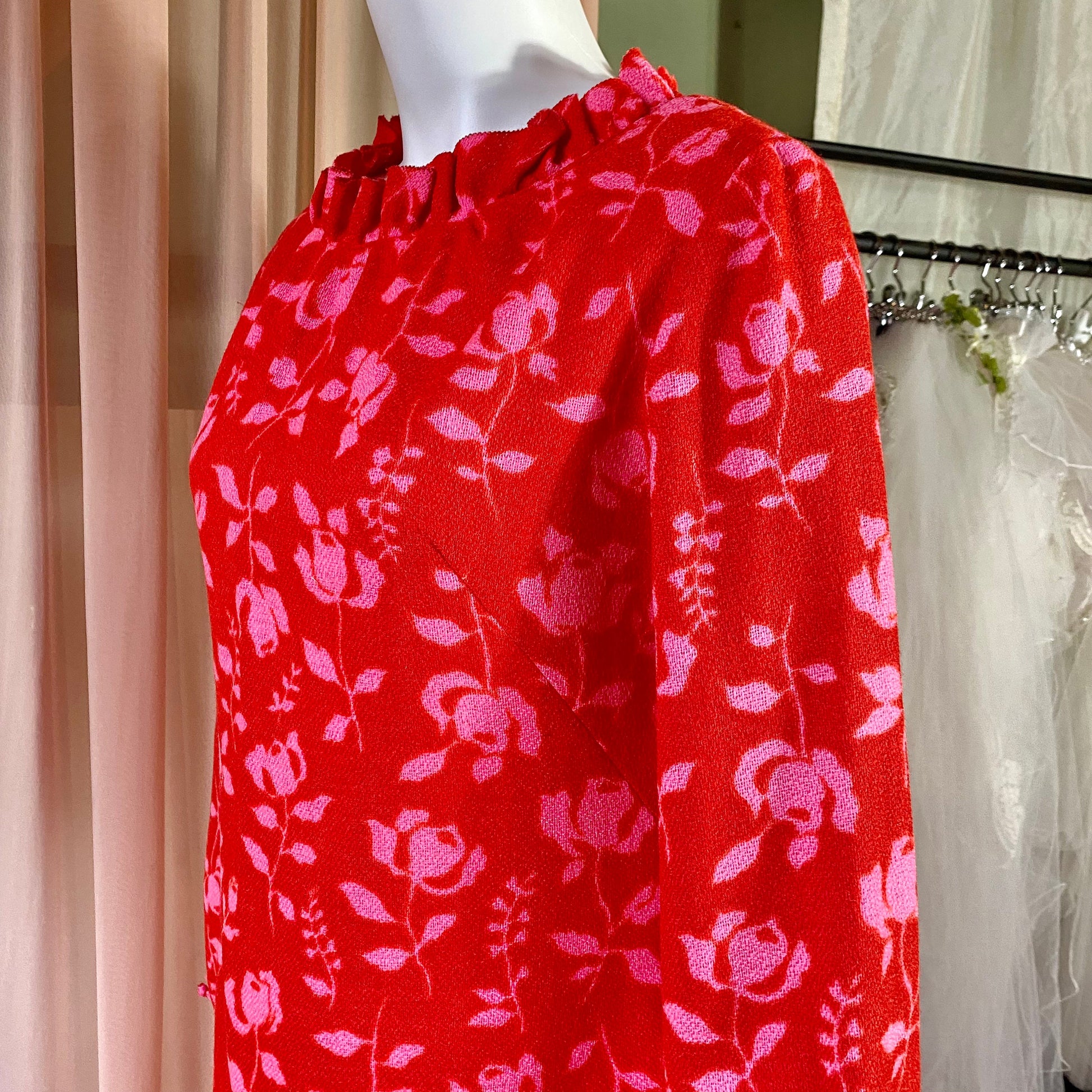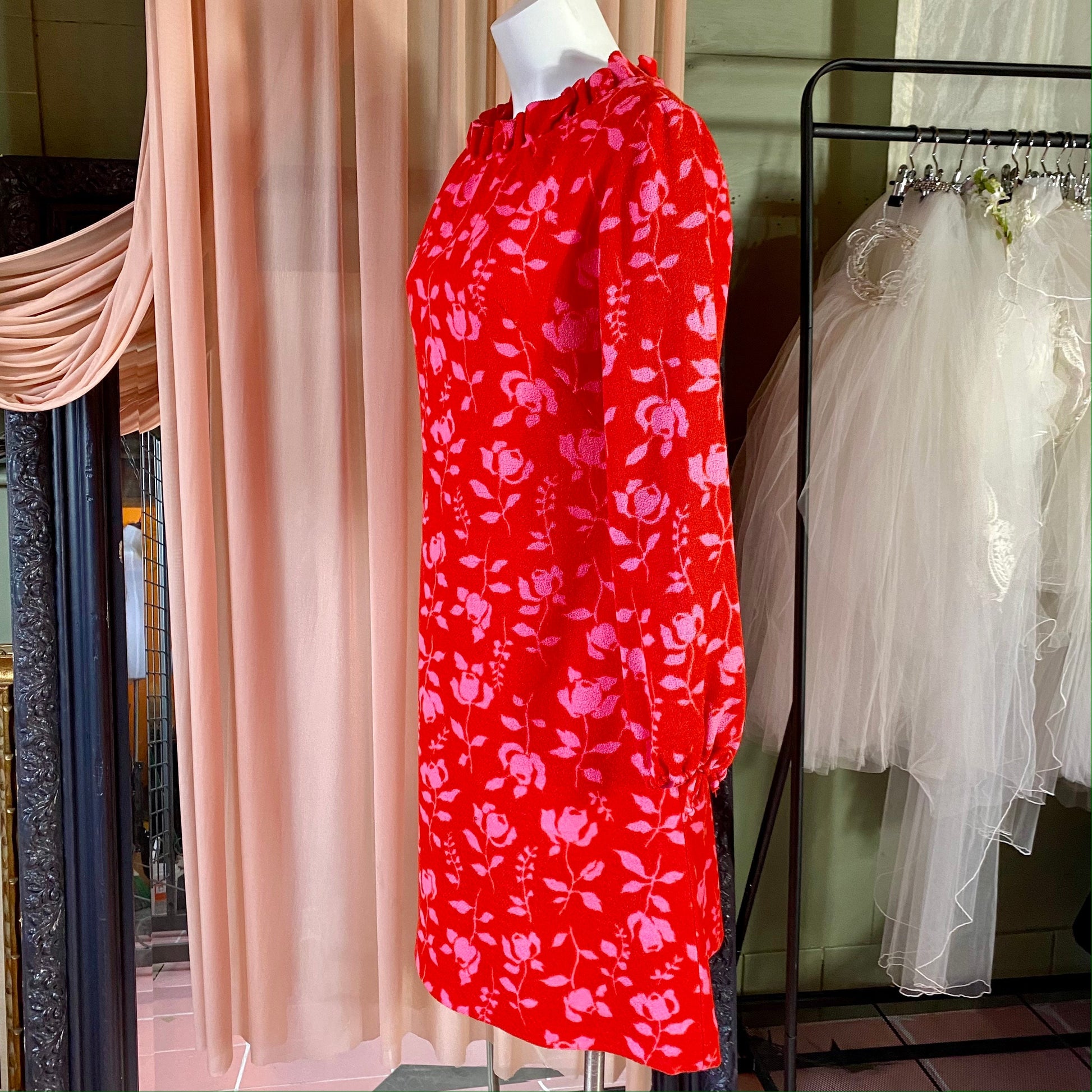 Bright red knee length dress with pink roses. Crew neckline with ruffles around the collar. Long peasant sleeves.